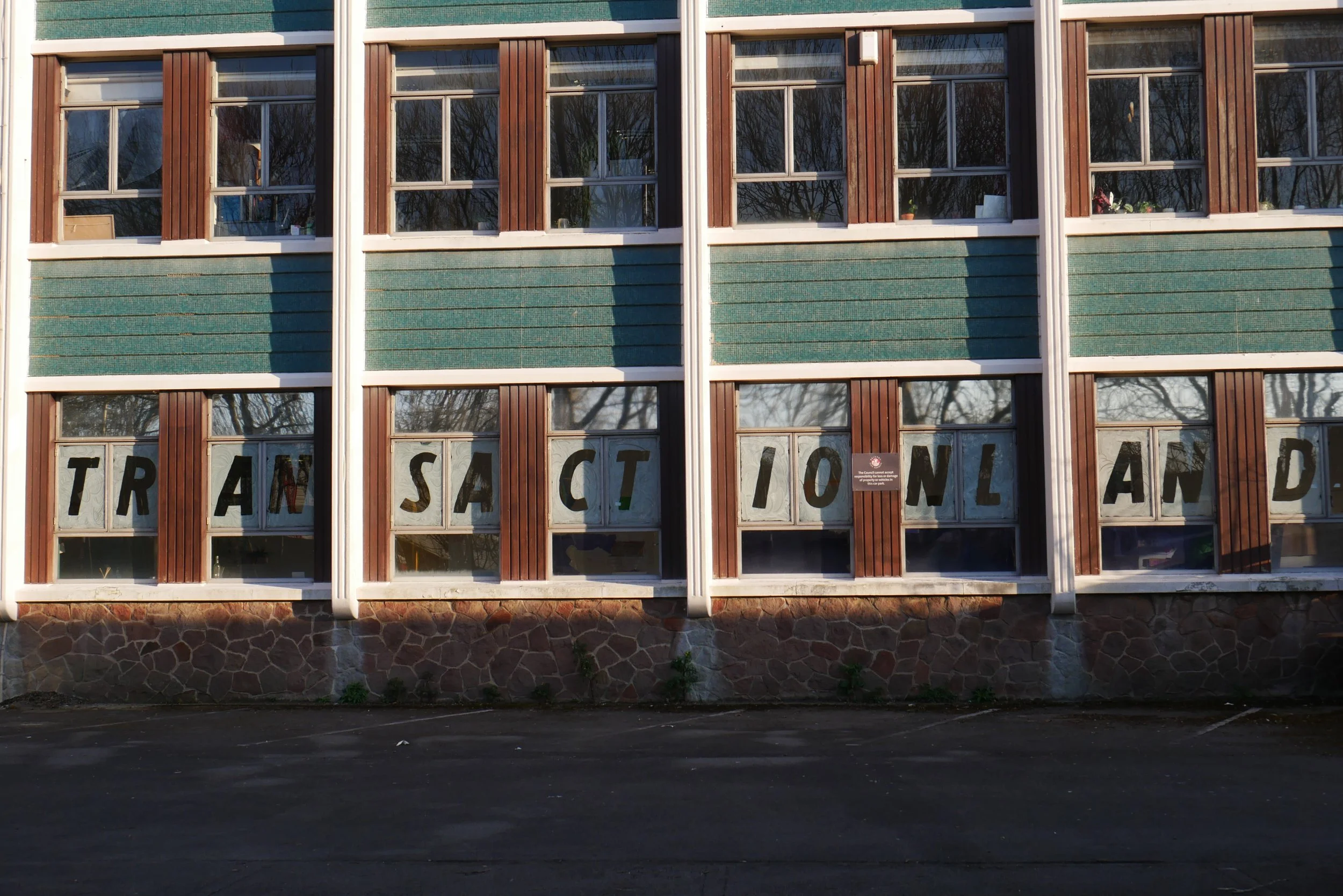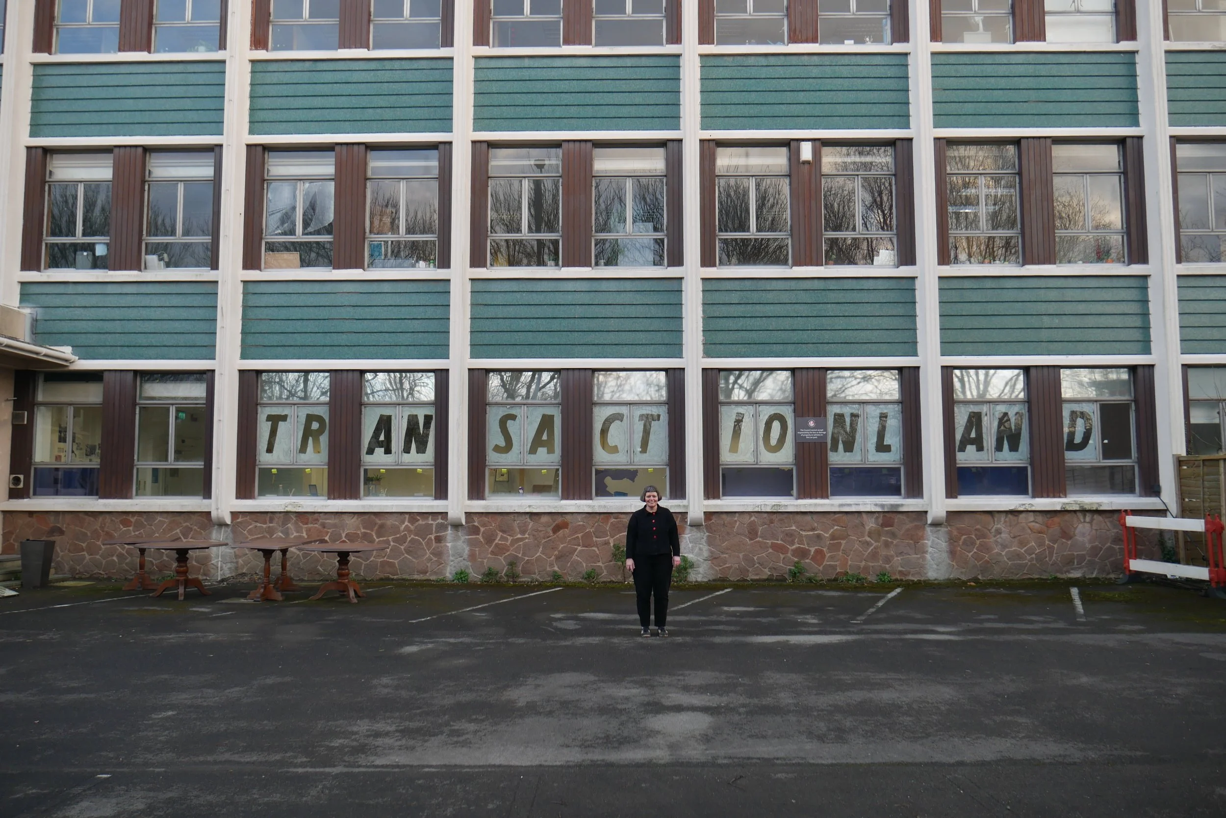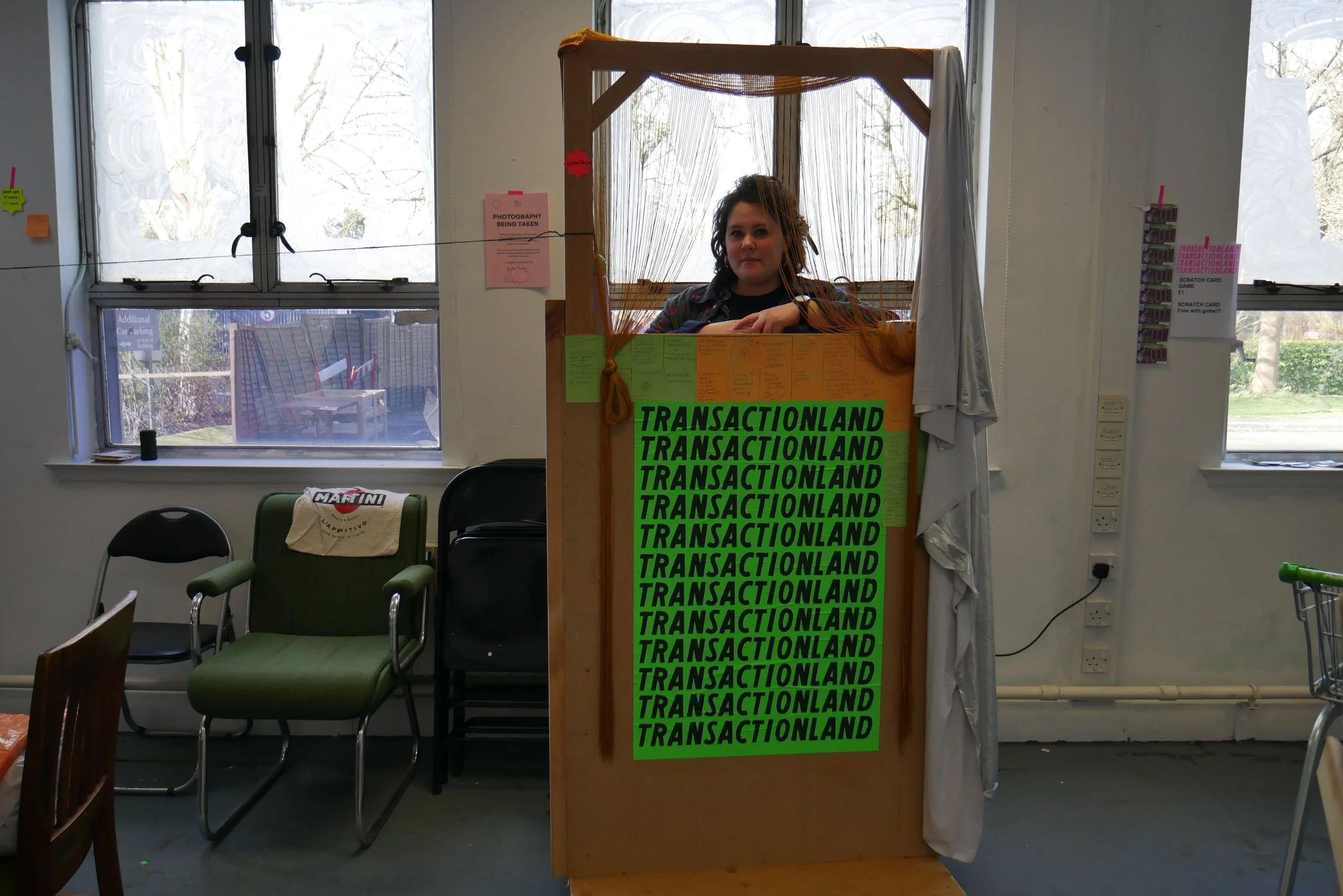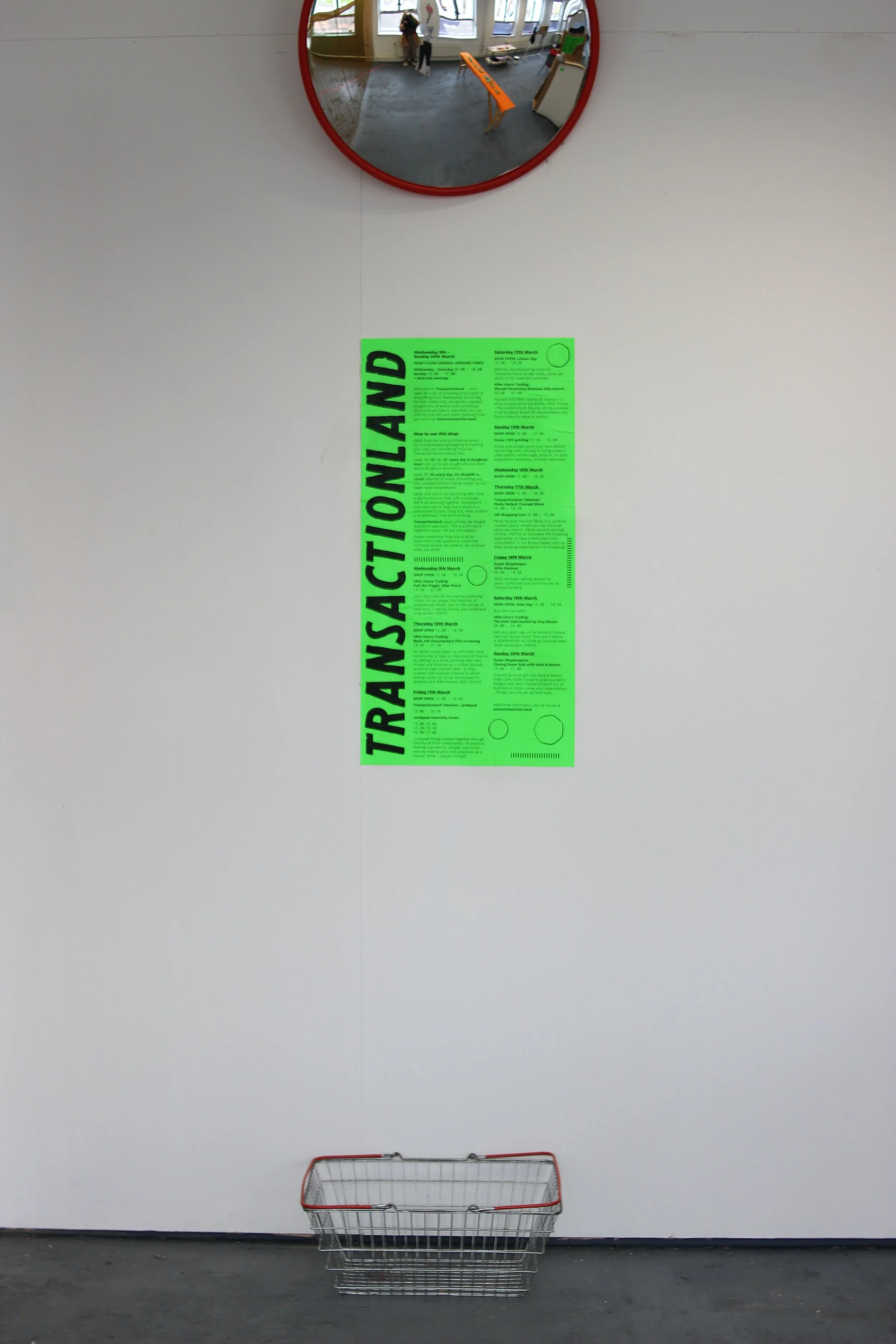 ‘TRANSACTIONLAND’ was stencilled across the shop windows with white paint typically used on the windows of closing-down shopfronts. In the spirit of a temporary pop-up, furniture was made entirely from scrap materials, returned to scrap after the shop closed. The furniture was also all on wheels. Curved mirrors were installed to guard against shoplifters, and shopkeepers wore red tabards while on shift.